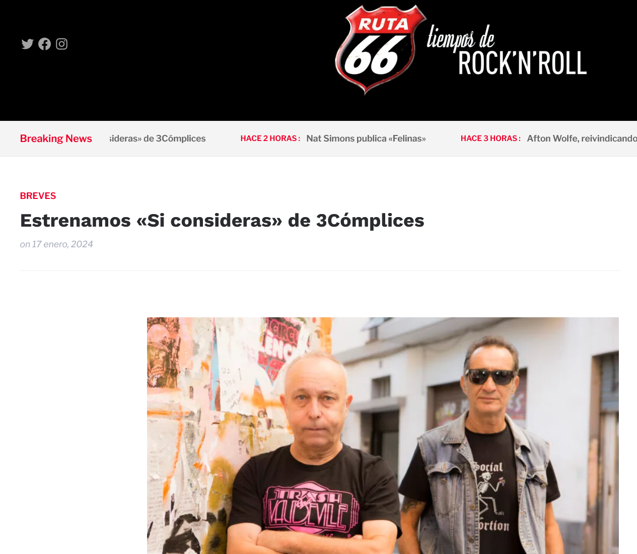 El pasado 17 de enero, los chicos de Ruta 66, nuestra revista musical de cabecera, le han dedicado unas líneas a nuestro segundo single adelanto de lo que será el álbum "La Tragedia". Muy agradecidos por el trato dispensado a nuestro nuevo lanzamiento y esperamos que cuando tengan el Lp al completo lo gocen tanto como nosotros. Recordemos que Ruta 66 se publica desde 1985 y por suerte para nosotros todos nuestros trabajos hasta el día de hoy se han visto reflejados en sus páginas. Allí queda constancia del "De espías, policías y ladrones..." (1986), "Aviso: Se lee 3Cómplices" (2015) y, esperando turno, "La Tragedia" (2024).